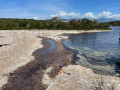 Emprunter le chemin à gauche, longer le bord de mer sur environ deux kilomètres et demi avant d'arriver à une digue de posidonies qui obstrue un étang. Continuer sur le chemin qui longe l'étang jusqu'à arriver à un long mur de pierres. Le franchir avant de le longer sur la gauche. Après un petit monticule arriver sur une passerelle en bois.