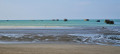 (2) Face à la cabane Stanley Hollis, continuer à droite vers l'Ouest sur le Paisty Vert, puis sur le Chemin du Marais qui serpente dans la dune parallèlement à la plage (Gold Beach). Le sentier débouche sur la digue d'Asnelles.