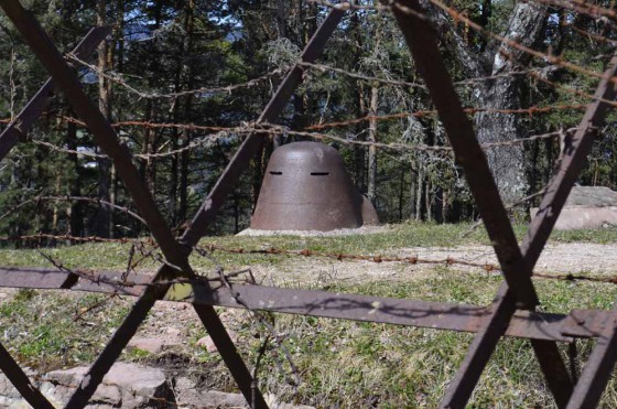observatoire d’artillerie allemand. En arrivant au sommet, apparaissent déjà plusieurs blocs d’un rocher aménagé et dirigé vers le sud et vers l’ouest. Juste derrière ces roches, se trouve, scellée dans la terre et les blocs de granit, une étrange guérite métallique en forme d’escargot,
