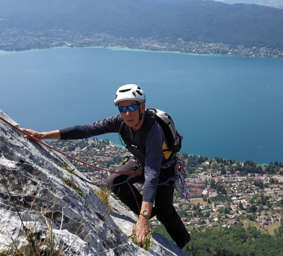 (3) Continuer le sentier à gauche : le panneau indiquant la direction La Croix du Roy est manquant. Dès lors, l'atmosphère change quelque peu et devient plus minérale, le sentier un peu plus raide. Profiter d'un joli passage creusé dans la roche, sécurisé par une barrière sur toute sa longueur, et qui offre une vue très impressionnante sur le Lac d'Annecy. Continuer jusqu'à la Combe et au refuge du même nom.