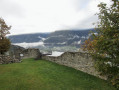 (2) Vous longez un tertre sur votre gauche : la ruine est sur ce tertre. Il y a plusieurs accès mais l''accès principal se fait par un escalier en bois droit devant vous. De là-haut, vous découvrez une vue dégagée sur la vallée (les informations sont en allemand et en italien). Redescendez par l'escalier et repérez devant vous le panneau Jaune: Römerweg/Stronach qui vous demande de monter droit sur une ferme (la plus proche au-dessus de vous). Vous montez entre deux pâturages délimités par des clôtures en fil blanc.
