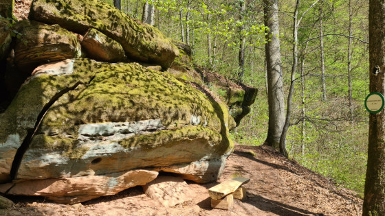 Un petit banc pour vous reposer ou pique-niquer à l'ombre de ce rocher en pleine forêt.