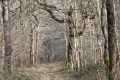 (6) Poursuivre en face, dans un chemin en pleine forêt qui traverse les Usages d'Availles. Aller jusqu'à un croisement de chemins, à une centaine de mètres au Nord d'une clairière bordée du côté Nord par le Chemin du Loup. Prendre le chemin de droite qui va vers le Nord-Est, en se rapprochant du chemin dit Route de Latillauderie desservant l'Asinerie du Baudet du Poitou, située un peu plus au Sud.