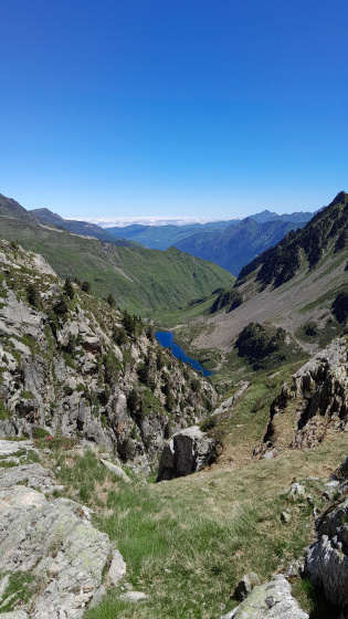 En montant après le premier pierrier, avant l'abri sous pierre. Prendre un peu de hauteur pour avoir cette magnifique vue sur le lac d'Ilheou en contre bas