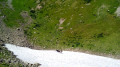 (5) À proximité de la pointe Sud-Ouest du lac, passer un portillon puis obliquer à droite. Remonter la combe herbeuse de La Chéneau vers le Pic Chaussy. Effectuer un virage en épingle sur la droite et continuer à monter jusqu'à un col (sans nom sur la carte).
