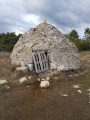 (6) Au prochain carrefour, laisser la piste rectiligne pour tourner à gauche dans un petit chemin qui serpente. Attention il n'y a pas de direction spécifique qui invite à tourner. La balise 28 signalée sur la carte n'existe plus ! Ce chemin est balisé en Jaune peu après avoir tourné. À proximité de la ligne à haute tension, la balise 29 est cassée. Prendre alors sur la gauche du panneau "Bois d'Amon". Passer sous la ligne à haute tension. Rester ensuite sur la droite. Le chemin devient caillouteux. Arriver sur un terre-plein et admirer sur votre gauche une jolie petite cabane de pierre sèche (borie) et des ruines d'un village sur la droite au dessus de l'esplanade. Reprendre la piste caillouteuse sur quelques mètres.