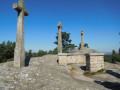 (9) Dans le virage à gauche, prendre presque en face le chemin de traverse en descendant vers le cimetière. Dépasser un croisement et déboucher sur la route (calvaire) avant le croisement avec la D348.