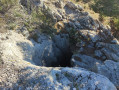 (8) Arrivé sur le flanc Est du fond d'un vallon visible sur la droite, laisser la sente continuer vers le Nord et partir à droite, vers le Sud en marchant à vue au-dessus du vallon. La sente n'est plus très visible mais plusieurs cairns permettent de trouver l'Aven des Marseillais (173 m de fond), aussi appelé Gouffre des Quatre Trous, sur la pente du vallon. Au-dessus de la faille verticale du gouffre se trouvent plusieurs trous observables en montant sur le talus au-dessus de l'aven.