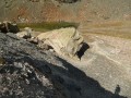 Lorsqu'on commence à avoir une bonne vue plongeante sur les Lacs du Longet, il est temps de repérer sur la droite un petit couloir blanc pas trop raide, bordé par des calcshistes beige clair. Le sentier s'élargit dans une pente schisteuse et il faut rejoindre une draille au pied d'une barre. La contourner pour rejoindre le Ravin de la Noire et un lac non nommé vers 2890m.