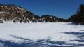(6). A l'abri, des marques jaunes sont présentes. Prendre soin de contourner l'étang par la droite, en restant loin des berges gelées et enneigées. Continuer vers l'Est sur 400 m depuis l'abri et quitter le balisage du GR®10 Rouge et Blanc.