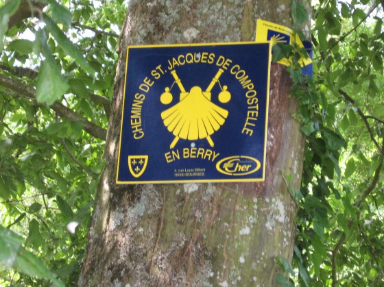 Panneau du chemin de St J de Compostelle, au dessus de la passerelle sur le Langis.