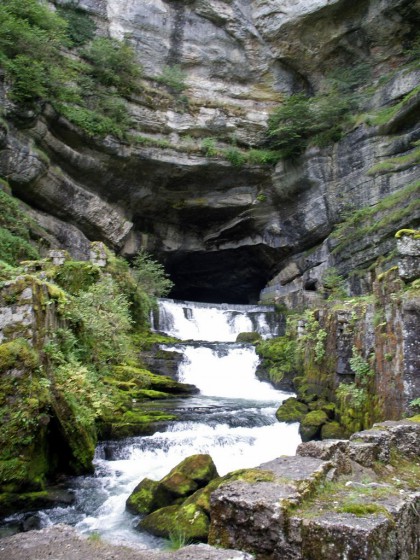 La Source de la Loue : La résurgence sort, jaillissante, de la paroi de la falaise, imposant cirque rocheux.