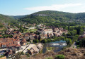 (4) Un peu plus haut, partez dans un sentier herbeux à droite (pancarte forestière n°49 cachée dans le feuillage et pancarte Roche du Châtelet en contre-sens de la marche). Vous longez le parcours de santé et, bientôt, vous atteignez un banc pour une petite pause. Vous arrivez au point de vue, puis descendez prudemment en utilisant les mains courantes.