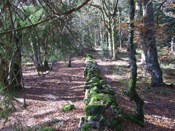 Le muret marquant la frontière Franco/Allemande édifié après la défaite de 1870. On remarquera plusieurs bornes gravées des lettres F sur une face & D sur l'autre ainsi que leur numéro sur le coté (ici dans les 3000)