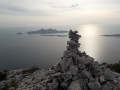 (8) Juste avant d'arriver au sommet, à moins de 15 mètres de la crête sommitale, une croix Verte à votre droite vous interdit l’accès d'un petit sentier qui part vers les crêtes de droite. Rejoindre le sommet de celles-ci et juste avant un promontoire rocheux, accéder à un petit coin de paradis, la Corniche de Titou et Ninou,(du nom de deux amoureux des années 30) qui surplombe la mer et vous offre une vue magnifique sur les îles, il serait dommage de ne pas faire ce petit détour, merci de respecter ce lieu.