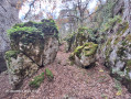 (4) À la cote 884, rester près de la crête pour continuer sur le sentier en négligeant la piste qui démarre sur la gauche. Le sentier va s'écarter de la crête pour pénétrer dans un espace boisé mais revient en bordure de falaise à un lieu-dit appelé les Baus sur la carte IGN. Un cairn marque un départ de sentier à 90° sur la gauche.