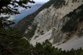 (8) A la sortie du 1er virage à gauche et bien après le belvédère panoramique, quitter la route pour emprunter le GR®4 qui part à droite dans les pierriers. Un cairn est là pour indiquer le départ. Suivre le balisage Rouge et Blanc et les nombreux cairns. Descendre avec de nombreux lacets indiquant les virages. Petit à petit, quitter les pierriers pour revenir en forêt. Poursuivre jusqu'à retomber sur la piste forestière.