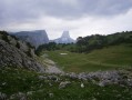 (8) Peu avant une zone d'éboulis traversant le vallon, commence un sentier discret, qui s'élève sur la gauche, non-marqué sur la carte IGN. Ses petits cairns sont assez repérables sur le terrain. En les suivant, on retrouve le sentier de la carte, lui aussi cairné, qui mène à l'ancienne Jasse du Jardin du Roi.