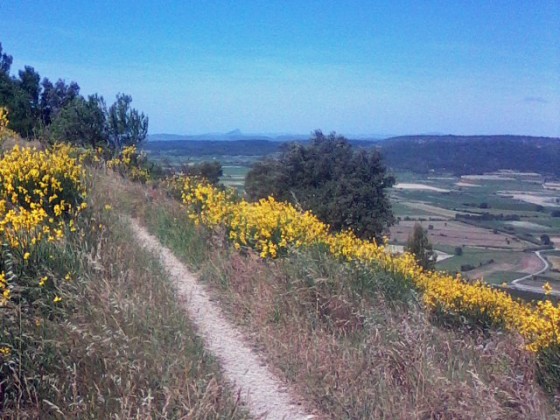 Depuis la montée vers l'Oppidum, on surplombe la vallée de la Vaunage, le Pic Saint Loup et l'Hortus se distinguent au loin.