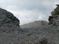 (8) Voici la base du couloir d'accès aux pentes sommitales, moins austères. Le passage à droite en montant semble le plus utilisé. À la sortie on emprunte la trace qui part à droite et passe sous l'antécime d'altitude 3483 m. Il faut bien rester sur la trace Nord-Est. On évite le sommet par la gauche pour arriver sur le départ de l'arête Nord qui mène à la Pointe de Ronce. Les 2 pointes sommitales sont là toutes proches à quelques mètres.