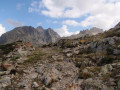 (5) Au Colle Est della Paur, le sentier descend dans l'éboulis. Repérer le départ (marques Jaunes) : globalement, le sentier évolue en restant plutôt à gauche dans la descente pour rejoindre le premier lac.
