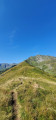 (3) Prolonger sur la crête (laisser le GR® partir à gauche) et dépasser l'arrivée du Téléski d'Arbesquens. Dépasser un pylône électrique, continuer Ouest-Sud-Ouest et emprunter un sentier raide montant à travers quelques arbres. Continuer sur un sentier aérien en crête avec le Pic de Céciré droit devant. Atteindre une antécime à l'altitude 1977 m.