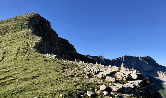 La Rama (2378m) est à peine effleurée par le soleil, alors qu'un pan entier de la Tête de Vachères (2402m) est déjà éclairée.